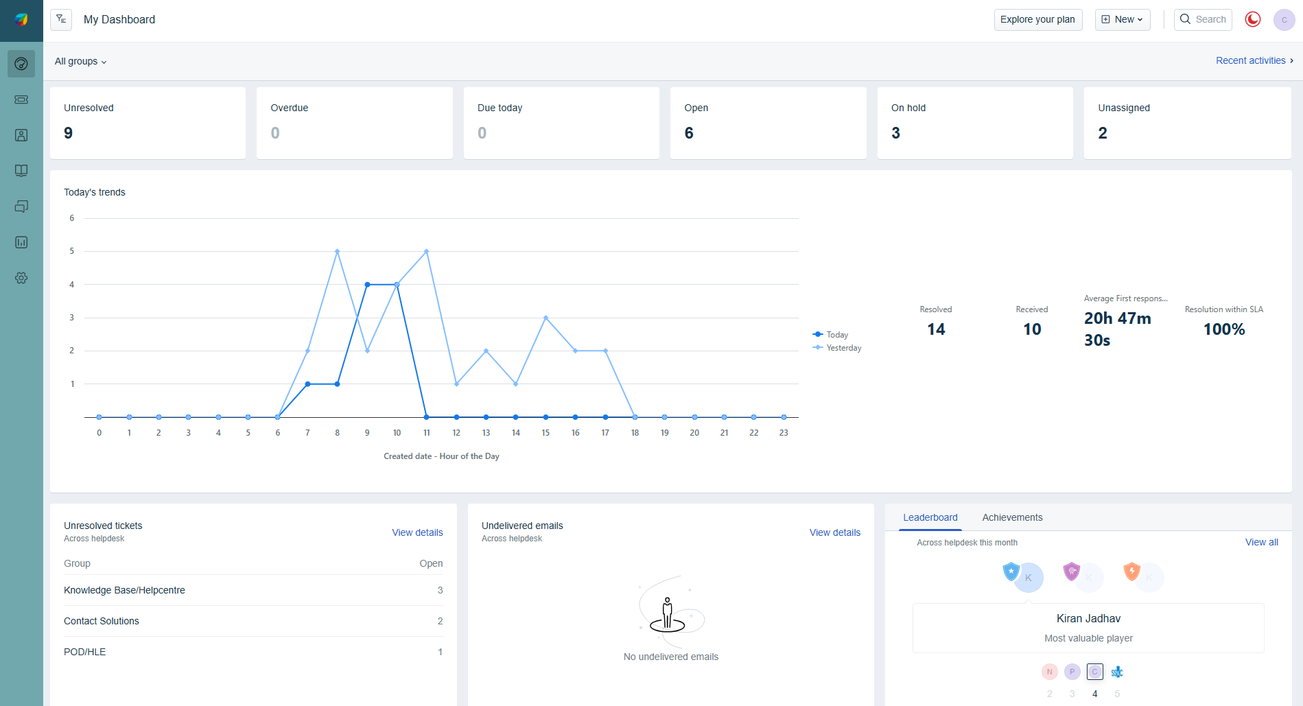 As a Manager, you can customise your dashboard to show just the required metrics for your teams. This customised dashboard gives the agents of that team visibility into tickets that require immediate attention, helps them to quickly jump in and assist the team to improve team’s overall metrics, and even help motivate themselves to make it to the top of the leaderboard.