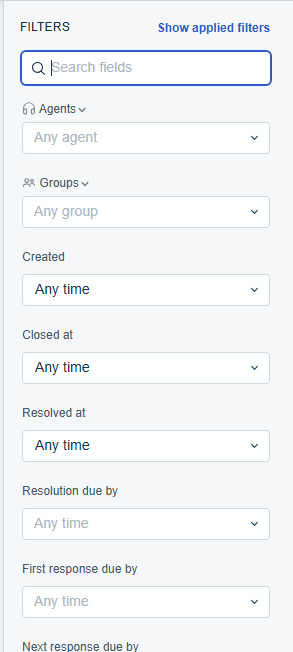 When viewing tickets, there will be a search pane on the right of the screen. This will allow you to filter the tickets by agent, group, status, response or resolution due date and a number of other criteria.