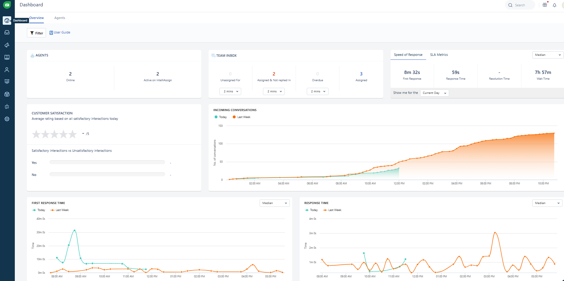 The Dashboard gives a real-time overview of all the current activities in your account, Dashboard helps you measure speed of response, monitor conversation trends, view average resolution time and deep dive into any team member's workload. It also gives you information on a tea member availability. Please note that this refreshes every 15 minutes